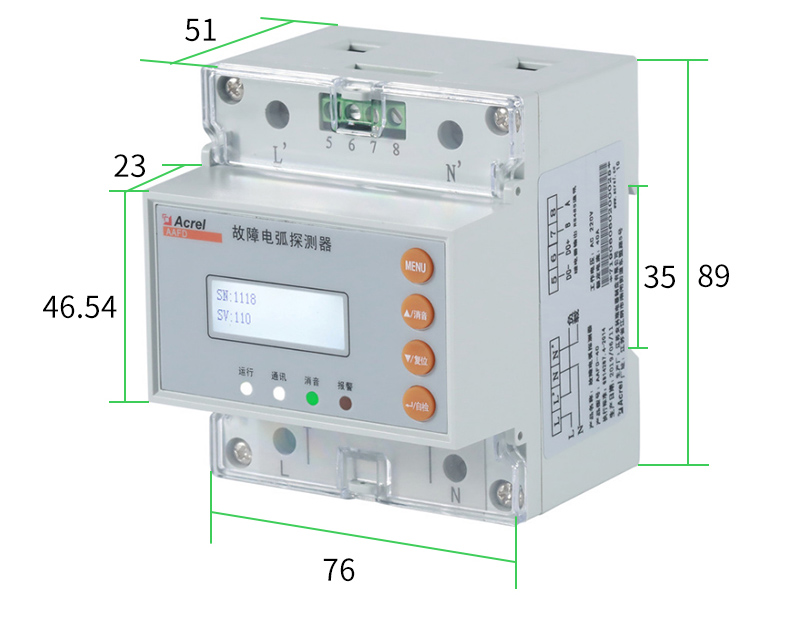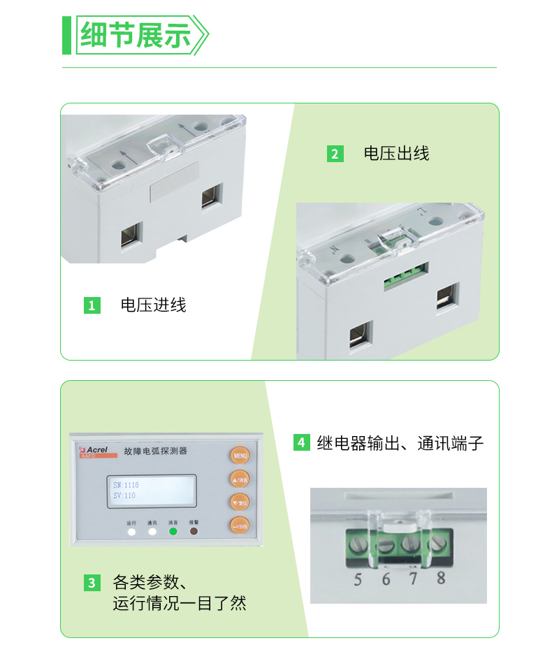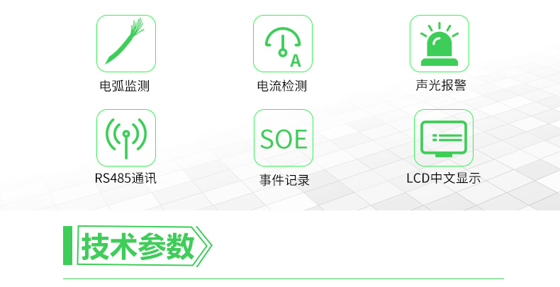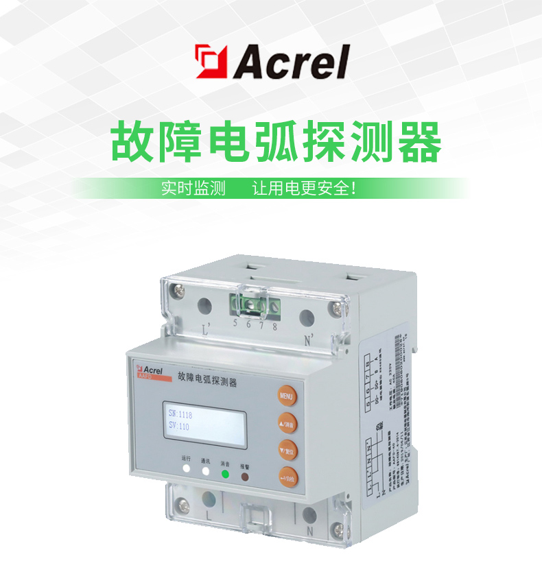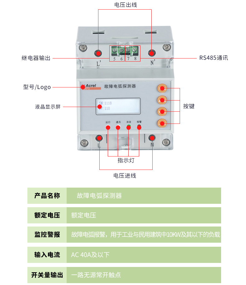 检测线路的故障电弧、1路继电器输出485通讯、导轨式安装、液晶显示;适用额定电流检测范围:0-40A