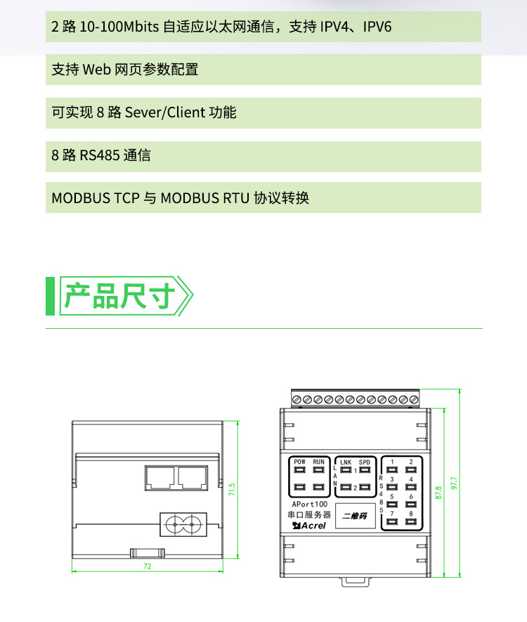 APort100串口服务器提供串口转网络功能,能够将RS-485串口转换成TCP/IP协议网络接口,实现RS-485串口与TCP/IP协议网络接口的数据双向透明传输,使得串口设备能够立即具备TCP/IP网络接口功能,连接网络进行数据通信,扩展串口设备的通信距离