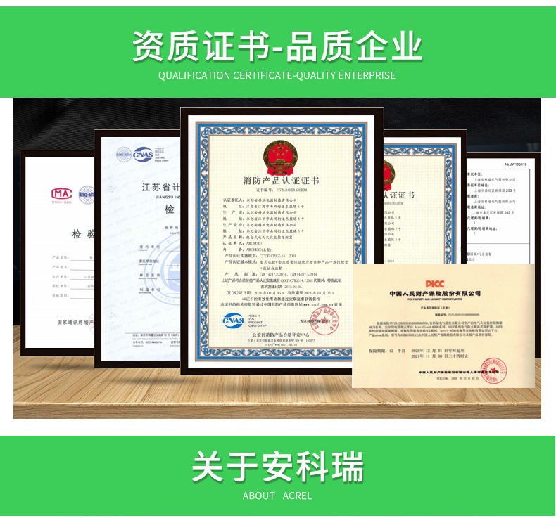 产品符合GB14287.2-2014《电气火灾监控系统 第2部分:剩余电流式电气火灾监控探测器,GBI4287.3-2014《电气火灾监控系统 第3部分:测温式电气火灾监控探测器》的标准要求。